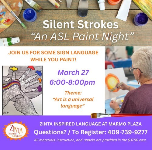 Friday, March 27th - Learn a bit of American Sign Language while painting at Zinta Inspired Language at Marmo Plaza at 6pm. All of the details and registration information is on the flyer. It will be a fun night!