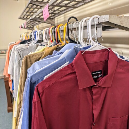 Our clothes closet operates on Tuesdays and Thursdays from 8:30-10am. With the help of our volunteers, clothing donations are organized by size and folks can come in and pick out an outfit, get necessities like underwear and socks and hygiene products like shampoo, razors and deodorant. If you have questions about current clothing needs, donating or volunteering, reach out to Pam Gilbert at drpgilbert@aol.com. If you're looking to donate clothes, you can drop them off at church Monday through Thursday between 9am and 1pm.
